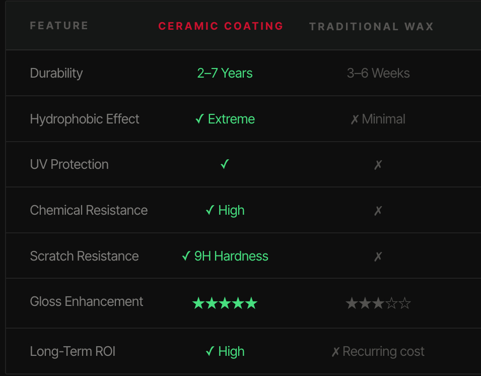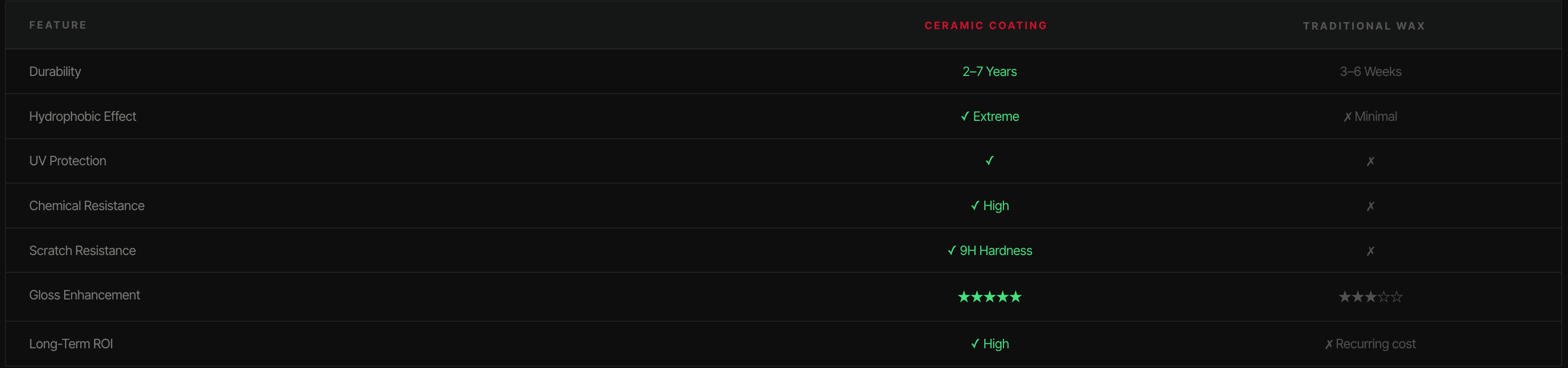 A liquid polymer that chemically bonds to your paint, forming a permanent hydrophobic layer. It repels water, UV rays, chemical contaminants, and minor abrasions. Unlike wax, it doesn't wash off — it lasts years. The gloss enhancement is unmatched.